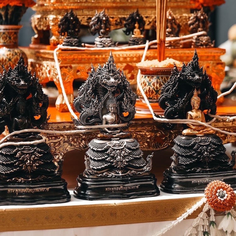 七龍佛的由來是根據古文獻所記載,據說佛陀在湖邊的樹下禪修時,邪惡羅摩故意施法,天氣突然變得非常惡劣,氣溫急速下降且暴雨不斷,讓釋迦摩尼處在狂風暴雨的環境中,意圖阻止釋迦摩尼的修行,就在此時濕婆神感悟到釋迦摩尼有難,便立即派了七龍王,下凡保護佛陀,七龍王為了保護佛陀禪修,不僅與羅摩鬥法,同時於佛牌身邊形成一道七彩保護傘,幫佛祖抵擋風雨令佛陀得以繼續禪修,此為七龍佛的由來,比喻佛法無邊佛祖庇蔭,因此在泰國是深受民眾尊崇的,也有傳說當時有鬼怪前來試驗佛的定力,更想進一步侵犯佛陀,所以佛陀後面現七龍佛的像,威嚴的樣子嚇退了來犯的鬼怪。