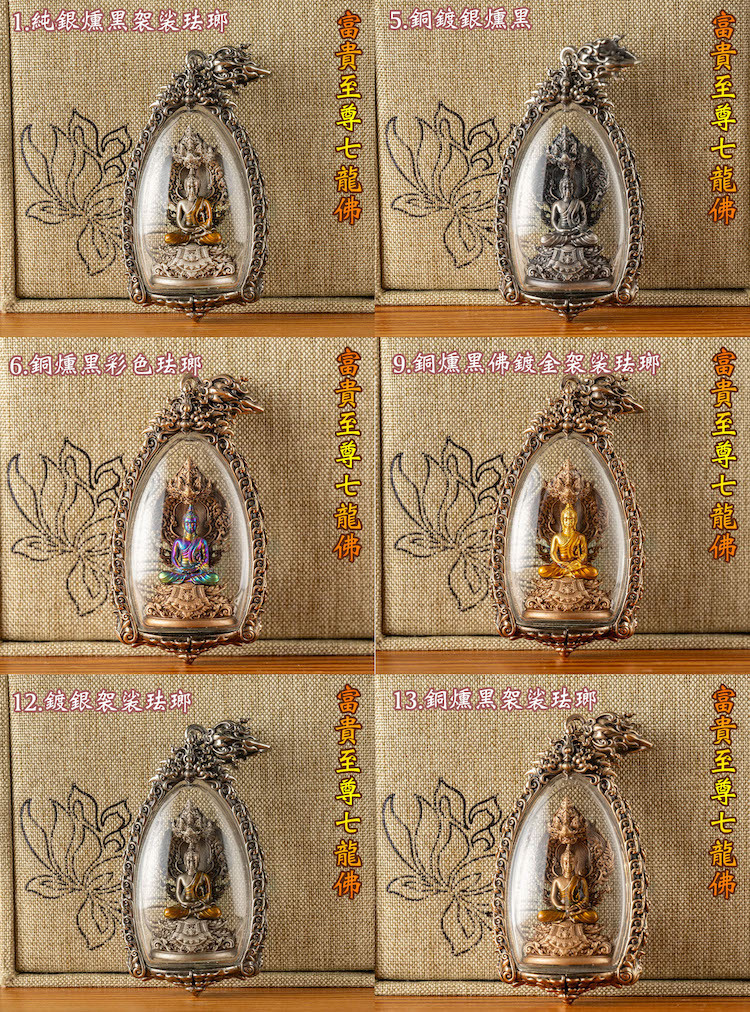 【七龍佛】也有開運佛祖的稱號,七龍佛有守護事業、安全、招財、助生意之意!是由佛像藝術大師以及龍波力孔共同設計以及加持,佛像每個細節都非常的精緻,後面有充滿了許多符文,每一尊皆有自己的獨立編號,由龍波力孔師傅舉辦大型法會請佛祖下來加持!外殼則是製作外殼的大師特別設計開模給此尊殊勝七龍佛雕花外殼,不管是收藏或者配戴都相當的適合,七龍佛最適合出生於星期六的守護佛,當然沒有規定只有星期六出生的人配戴,其他人配戴也是有相同的庇佑,在佛牌中避險能力是相當的強的,在泰國許多的軍警人員、生意人、從事危險行業者皆喜歡配戴,對於解災解難、逢凶化吉有一定的幫助。