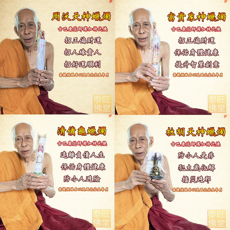 每個人在一生中都會遇到一些障礙,例如時運不佳、家運不好、健康不佳、夫妻不合、業績不好的時候,泰國人會藉由祈福蠟燭傳向天庭,請神佛幫忙加持自身給予庇佑,來自清邁的老高僧古巴康范師傅以在清邁相當有名氣,蠟燭上面貼的符文皆是高僧傳承下來的古老經文,每個顏色都有不同的效果,師父說一次越多蠟燭蠟燭效果會更佳,幫自己消霉運、保佑身體健康、事業順利、招財招生意、蠟燭雖然不能立竿見影,但只要定期持續點蠟燭,不管是生活還是運勢上都會慢慢有所提升,對於沒辦法配戴聖物的善信們來說,點蠟燭是一種比較簡易的祈福法事,由師傅在泰國幫各位師兄師姐祈福,只需要提供姓名以及西元出生年月日,而此點蠟燭善款師傅也捐於寺廟也是一種做功德的方式,不止可以幫自己增功德、消除業障、讓自己的運勢有所提升。(注意!此為師傅感謝大家幫忙建廟做功德,而幫大家祈福加持,非所謂的法師降頭黑法,如想要立竿見影或者是心存惡念者,請勿下單)