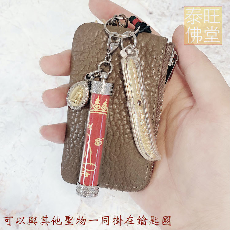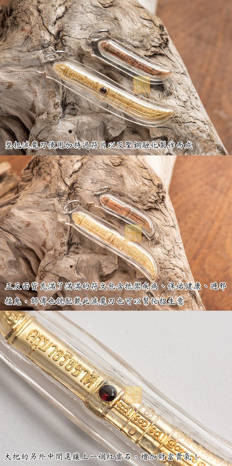 此法刀在泰文發音中稱為【滅魔】,並非字面上【滅魔】的意思,滅魔法刀是泰國非常具有歷史的法器聖物。擁有特殊的避邪開運的神力,無堅不摧,能夠抵抗外力入侵及驅趕邪靈治療疾病、預防疾病的法刀。在古代要運送物品或者出遠門,往往須要步行很久路程上會通過森林險峻,大部分都會攜帶滅魔法刀隨身而行,可以防止動物、邪靈和黑巫術的侵害,而僧侶、巫師也使用其為人們作法,驅魔和治療病人!相傳泰國人家中嬰兒若是突然哭聲大作,取刻出滅魔法刀放在小孩旁邊,不明黑影立即消失,小孩不哭,可以說是抵擋人所不可見之靈最好的法器,店主強烈每個人都必須要配戴一把,店主自己是佩戴在鑰使圈上面隨身攜帶,只要出遠門就一定會佩戴,此兩把是我最愛的古巴阿里亞查師傅督造,金色是大約2556年時督造(西元2013年),另一把是讓人更容易配戴於近年督造迷你滅魔刀,正反面都是滿滿的符文,攜帶起來更為方便,給小小朋友長輩配戴在脖子或者包包上都非常適合,如果有睡不好的問題,也可以將刀放於枕頭底下或者床頭邊。