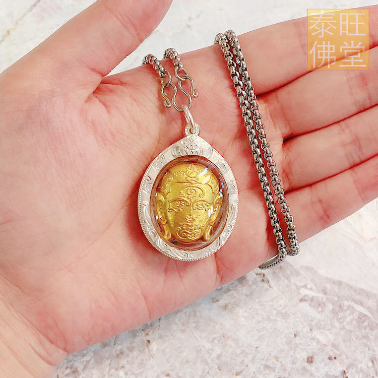 1.將金面坤平雙手合十拿著,唸誦經文(會附上紙本說明)並誠心祈求神佛給予保佑,再行配戴