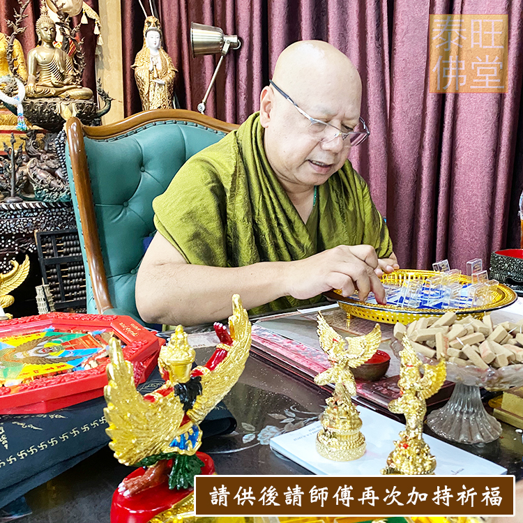 1.將金翅鳥雙手合十拿著,唸誦經文(會附上紙本說明)並誠心祈求神佛給予保佑,再行配戴