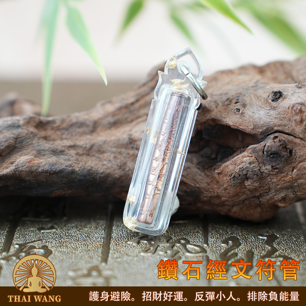 此符管是由八片鑽石經文片捲製而成,經文片上除了有壓印招財經文符印,裡面也有鑽石經文及象徵守護的圖騰、巴利經文,除此之外,當年佛寺邀集非常多位高僧,參與共同誦經加持包括龍波鬆砰、龍波乙、龍波們等十九位大師,利用各有擅長的法門共同加持,成為佛寺募款的結緣品,主要是祝福每位信眾,可以開運保平安,也由於符管是泰國最主流且熱門的護身佛寶,泰國許多佛寺及得道高僧都會修法加持符管,讓信眾可以隨身配戴,許多人都會佩帶符管,也因為在泰國實在有太多避災擋險的實蹟,報章媒體及民間都廣為流傳符管可以保平安。