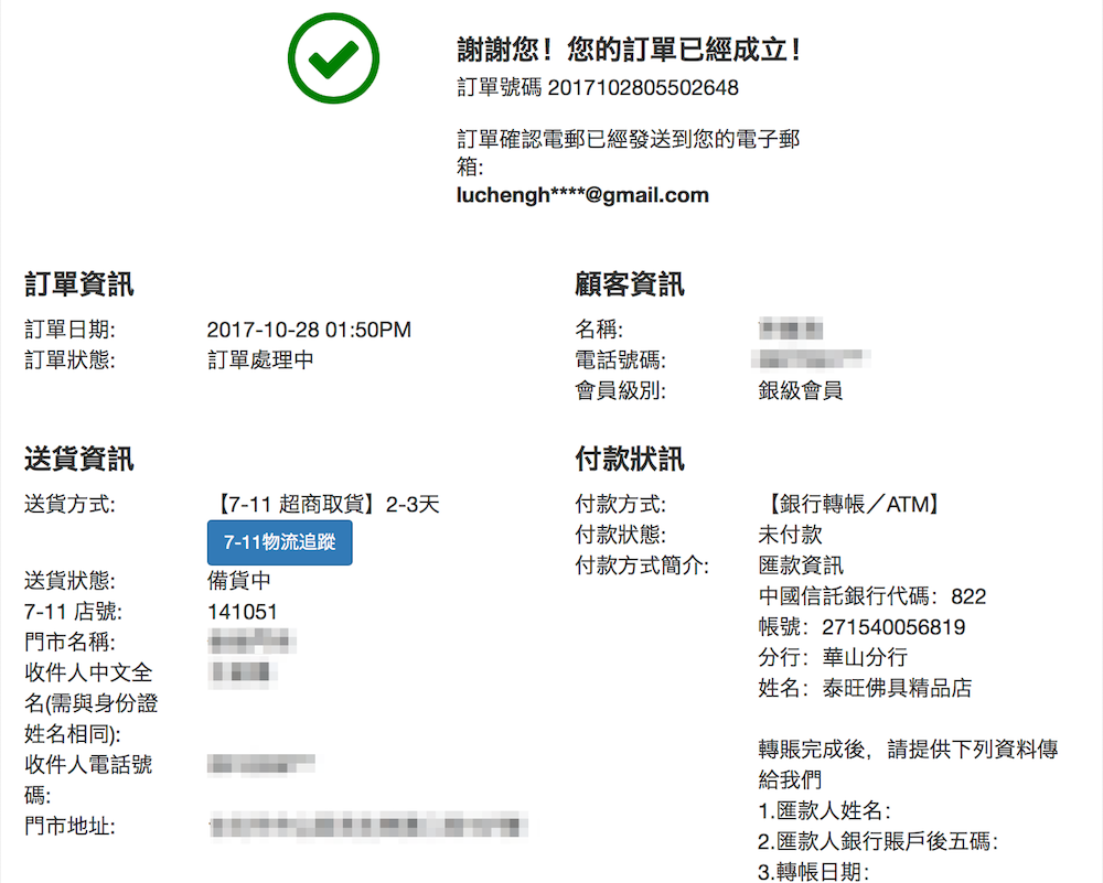 如訂單成功,會出現下面這個畫面以及一開始填寫的信箱以及手機都會收到一封訂購成功的信件訊息,如沒有看到下面這個畫面以及信箱沒收到訂單成功的信件,就代表沒有訂購成功,請重新訂購一次。