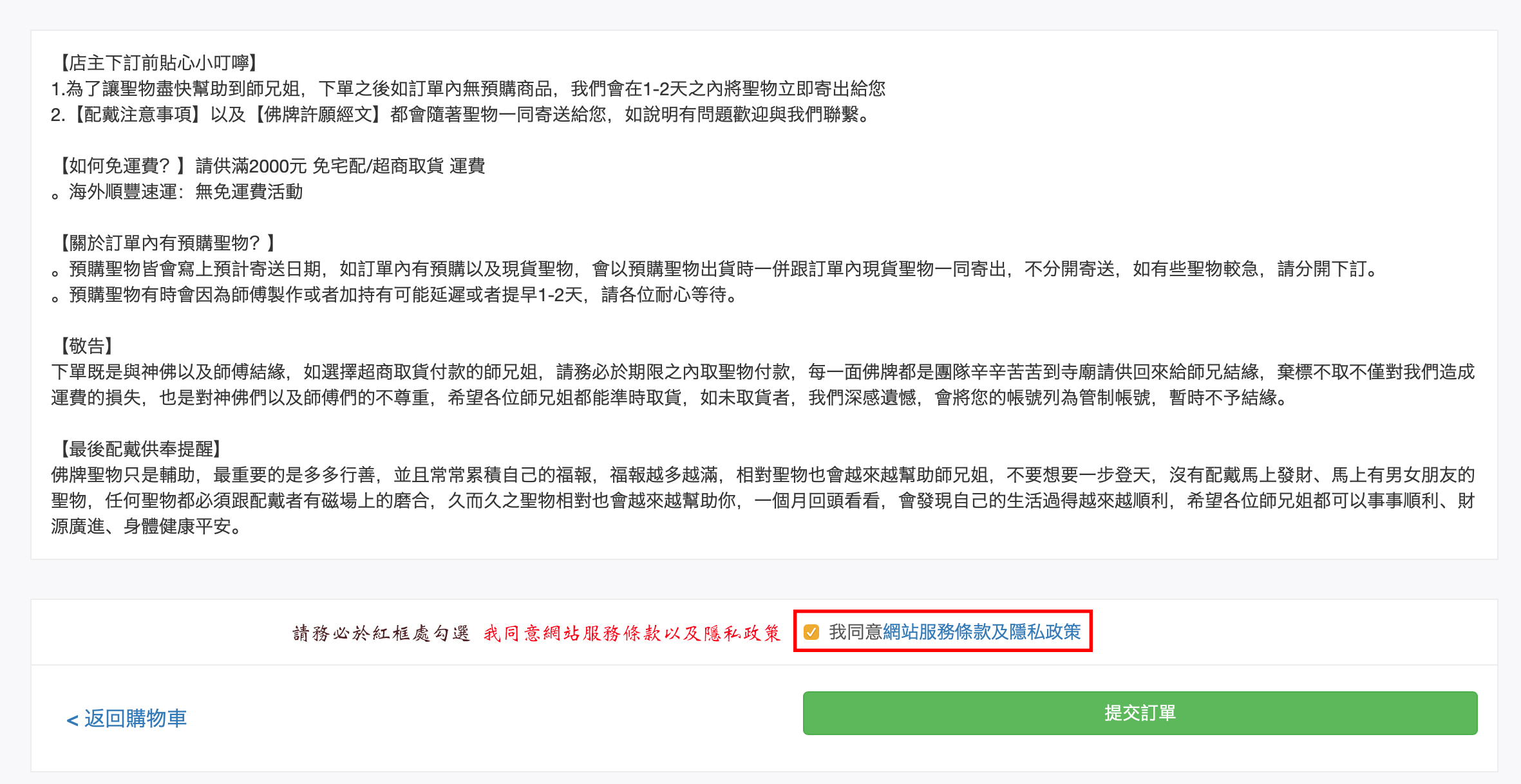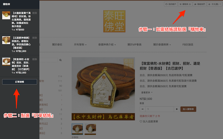 1.選擇聖物 > 2.加入購物車 > 3.進入購物車確認訂購 > 輸入會員帳號密碼或者不註冊會員 > 選擇結帳方式以及運送方式 > 完成購物 >非預購聖物將於3-5天之內到達指定超商或者住家