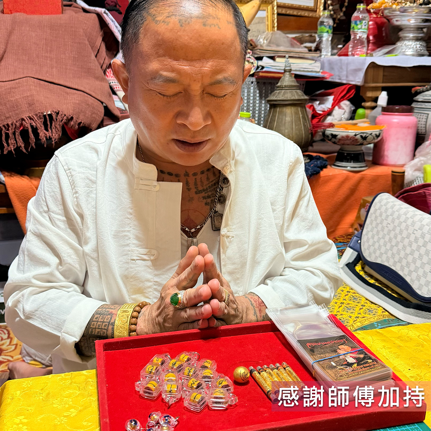 1.將聖物雙手合十拿著,唸誦經文(會附上紙本說明)並誠心祈求神佛給予保佑,再行配戴
