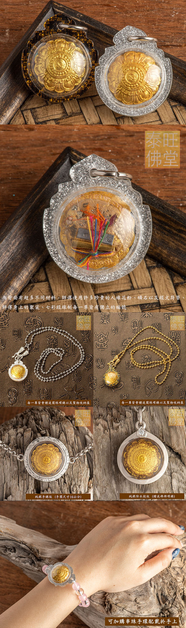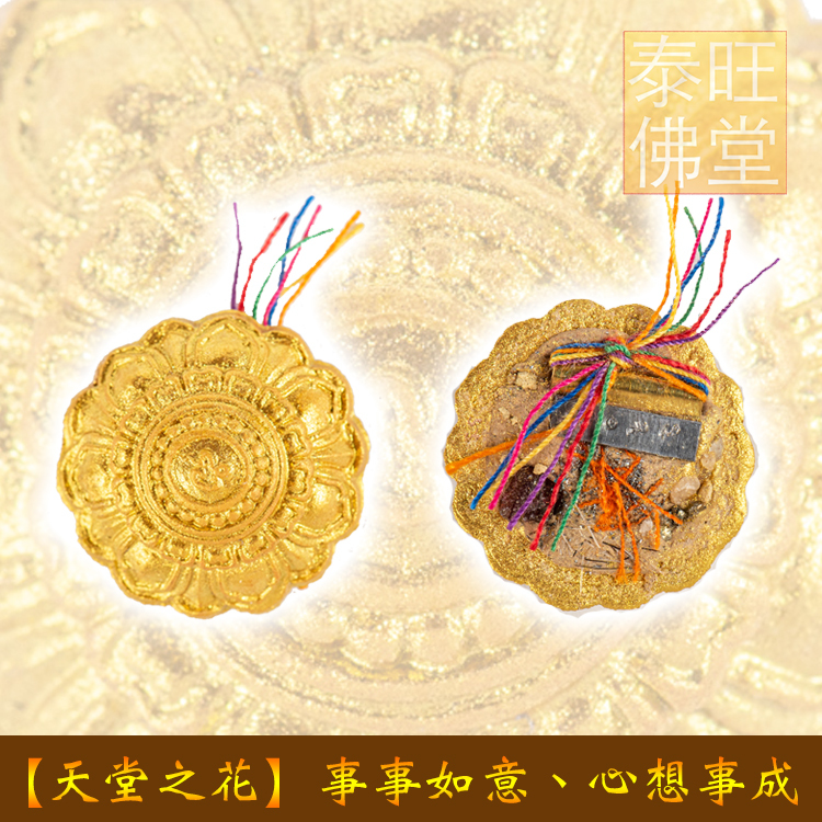 繼上次的千妻符管很多信眾分享有得到人緣上的幫助,這次店主又特別再次拜訪師傅尋求的新的聖物,天堂之花為顧名思義天上才有的花,代表幸福美滿、吉祥如意之意,為何製作這個聖物,傳說中天上有顆仙樹,而仙樹長滿了花朵,而這些花朵是由神仙們守護,有一天花朵從天上掉落人間,有個農夫無意間得到這朵花,覺得非常漂亮也非常香,拿回家供奉配戴,結果他祈求的願望大部分都可以實現,不管是工作上得到貴人的幫助或者是生意財運的增長、要金得金!任何事情都心想事成,龍普隆師傅製作了這個天堂之花,正面的花為窯烤製作,上金粉,而中間的字為 佛教 最有名的 納 ,而背面有超多不同材料,師傅使用許多珍貴的人緣花粉、礦石以及經文符管、師傅身上的袈裟、七彩經線制每一尊皆有獨立的編號,最後師傅長達三個月的加持,最後完美出廟!
