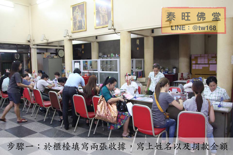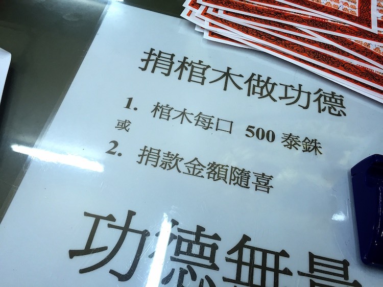 請到櫃檯捐錢,首先先在紅色的紙上上方寫你的姓名(英文或者中文皆可以),下方則是寫上要捐款的金額,接下來義工會將您的姓名寫在收據上面(寫中文義工為泰國人不會寫,通常姓名部分可能會叫你自己寫),當然捐獻金額是自己決定可多可少!(一副棺材是五百元泰銖)