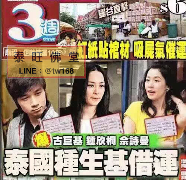 近日有泰國華僑爆料,稱香港藝人到曼谷捐棺、改運。據某周刊實地探訪,發現泰國一廟宇裡有古巨基、阿嬌和佘詩曼『捐棺材』的紅紙。原來這種《捐棺催運》的方式是透過捐助棺材給貧困人士,積福行善之餘,再貼上寫有名字的紅紙在棺材上,與屍同葬,「吸收運氣,改變運勢」。